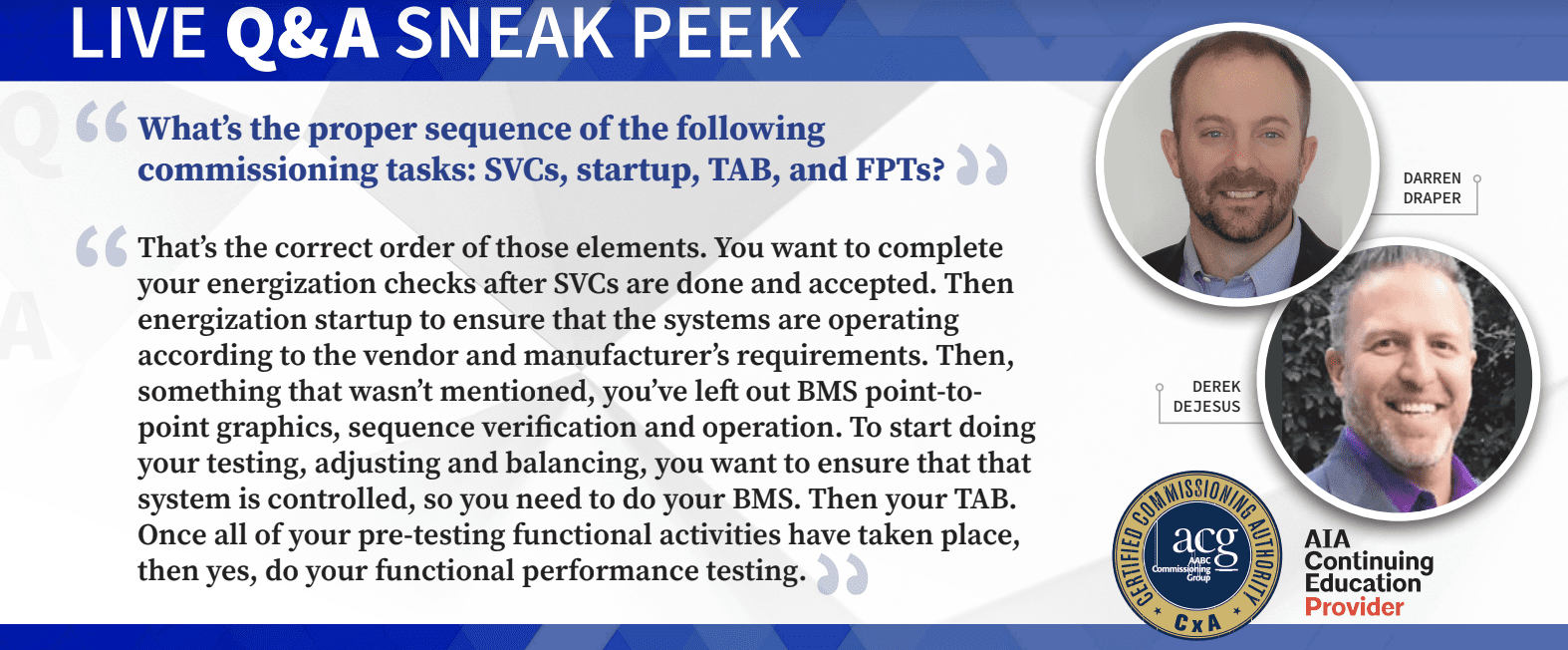 (Washington, D.C., August 27, 2020)—The AABC Commissioning Group (ACG) is offering a livestreamed version of its popular Certified Commissioning Authority (CxA) Workshop followed by a live 1-hour online Q&A session with its instructors to allow further explanation of concepts introduced in the recorded workshop.